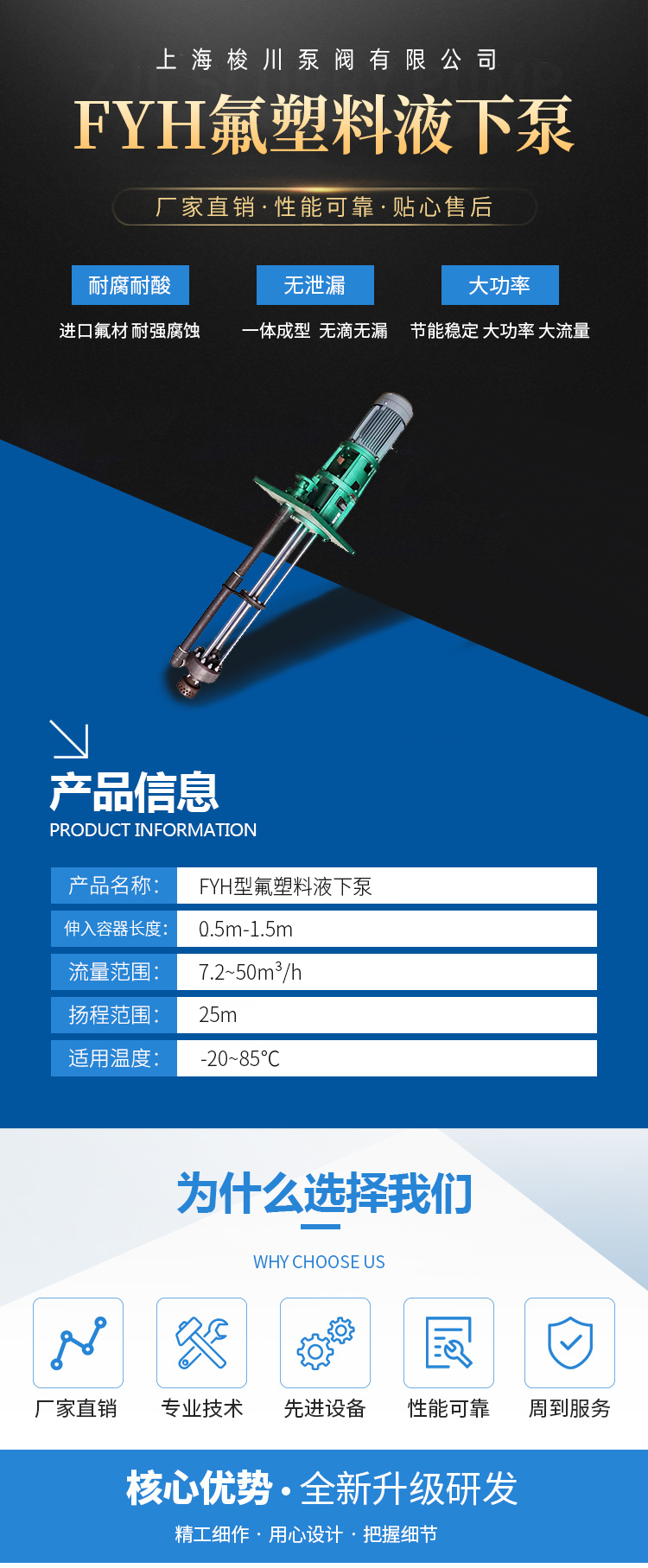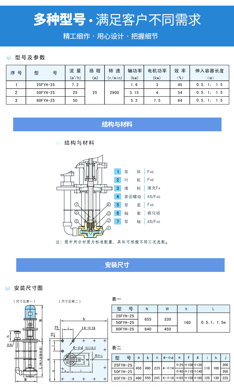 用途 本產品廣泛適用于輸送酸堿、有機溶劑、強氧化劑等腐蝕性介質。 適用溫度:-20℃~85℃ FYH型氟塑料液下泵是長軸立式離心泵,其接觸液體部分全部由氟塑料壓制而成,具有耐腐蝕范圍廣、效率高、重量輕、不需要灌液即能抽送、維修方便等特點。