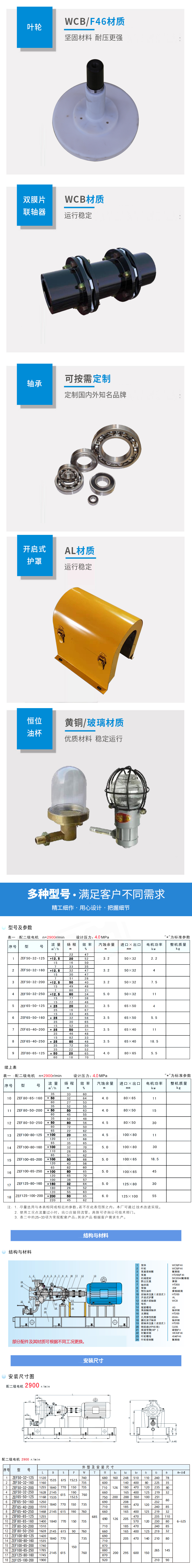 用途 本產品廣泛適用于:汽車行制造中的酸洗、噴漆工藝、有色金屬冶煉中的電解液輸送、離子膜燒堿項目中的氯水、廢水處理和加酸等工藝流程。 適用溫度:-20℃~150℃。 設計特點 標準化設計 ZEF氟塑料襯里單級單吸(OH2型)化工離心泵參考國際標準,結合國家相關標準設計制造,標準號如下: GB/T5656-2008 離心泵技術條件(Ⅱ) GB/T3215-2019 石油、石化和天然氣工業用離心泵 HG/T3183-2012 氟塑料襯里單級單吸化工離心泵技術條件 GB/T5662-2013 軸向吸入離心泵(16bar)標記、性能和尺寸 產品特點 1、泵體無底腳,采用OH2型中心線支撐,泵體鑄件材質為鑄鋼(WCB),基體焊接龜甲網內襯氟塑料,增強塑件附著力,法蘭等級標準采用PN4.0MPa,保證泵體足夠的耐壓強度; 2、葉輪采用金屬嵌件外包氟塑料壓制成型,依據密封形式不同分標準型與非標型2種葉輪結構形式; 3、密封腔體尺寸參考GB/T3215-2019 石油、石化和天然氣工...