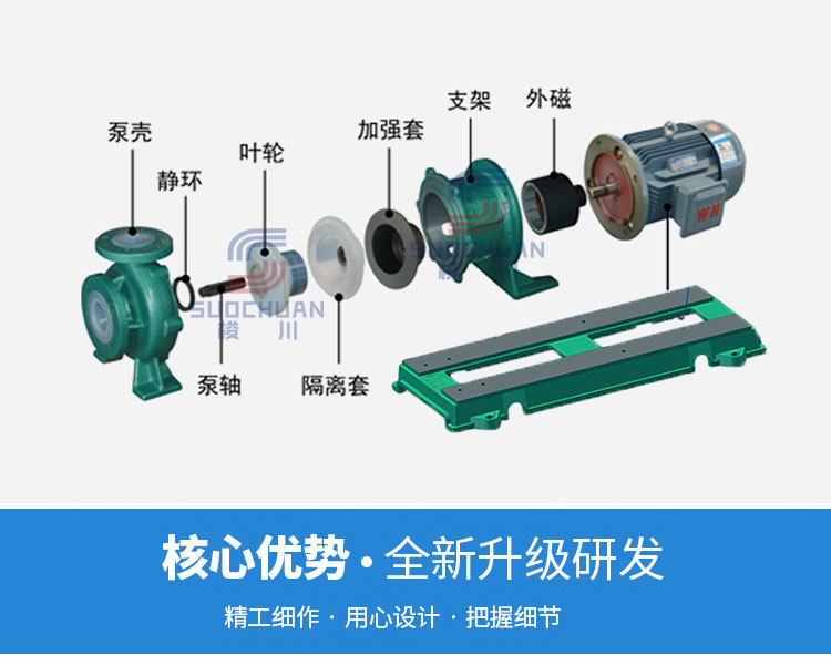 用途 本產品廣泛適用于:石油化工、制酸制堿有色金屬冾煉、汽車制造的酸洗工藝、稀土分離、農藥、染料、醫藥、造紙、電鍍、無線電等行業。適用溫度:-20℃C~100℃。 設計特點 防漏設計取消了軸封,利用磁力耦合間接驅動,完全消除了滴漏的煩惱,絕不污染場地。由于泵的過流部分選用“氟塑料合金”制造。可連續輸送任意濃度的酸、堿、強氧化劑等腐蝕介質而毫不受損。 工作原理 驅動裝置采用主動磁性聯軸器直接裝在電機軸上,泵腔完全封閉,通過磁力耦合間接驅動泵軸上帶磁鋼的葉輪旋轉,結構緊湊、安全節能。 堅固耐用的泵體 結構雖然接觸液體部分是氟塑料,但泵體基體是金屬材料,故泵體可以承受部分管道的重量及機械性沖擊,堅固耐用。