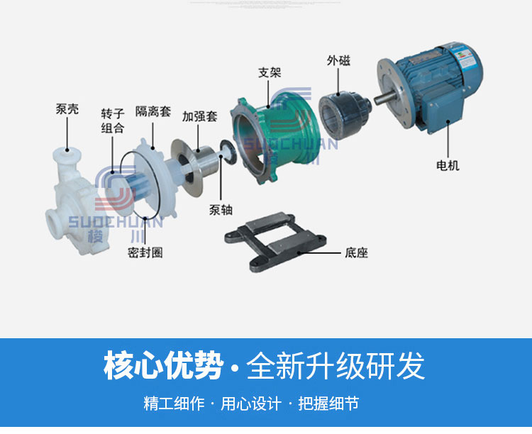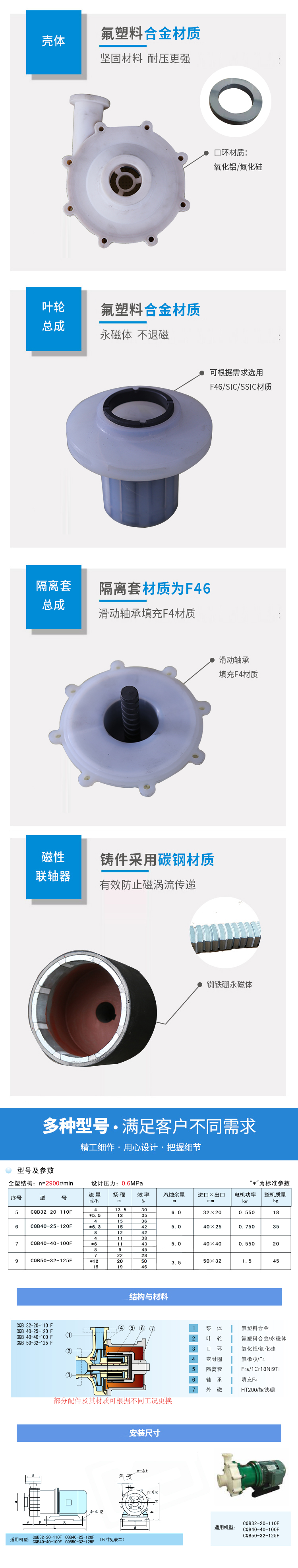 用途 本產品廣泛適用于:石油化工、制酸制堿有色金屬冾煉、汽車制造的酸洗工藝、稀土分離、農藥、染料、醫藥、造紙、電鍍、無線電等行業。適用溫度:-20℃C~100℃。 設計特點 防漏設計取消了軸封,利用磁力耦合間接驅動,完全消除了滴漏的煩惱,絕不污染場地。由于泵的過流部分選用“氟塑料合金”制造。可連續輸送任意濃度的酸、堿、強氧化劑等腐蝕介質而毫不受損。 工作原理 驅動裝置采用主動磁性聯軸器直接裝在電機軸上,泵腔完全封閉,通過磁力耦合間接驅動泵軸上帶磁鋼的葉輪旋轉,結構緊湊、安全節能。 堅固耐用的泵體 結構雖然接觸液體部分是氟塑料,但泵體基體是金屬材料,故泵體可以承受部分管道的重量及機械性沖擊,堅固耐用。